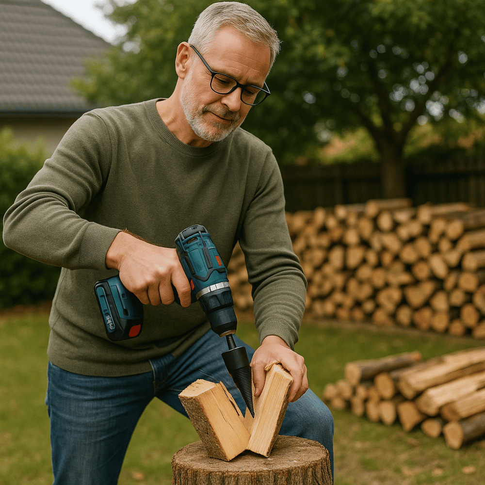 Instead of struggling for hours with an axe or splitting maul, you simply use the power of your cordless drill. The EasyWoodSplit saves you time, effort, and unnecessary steps.