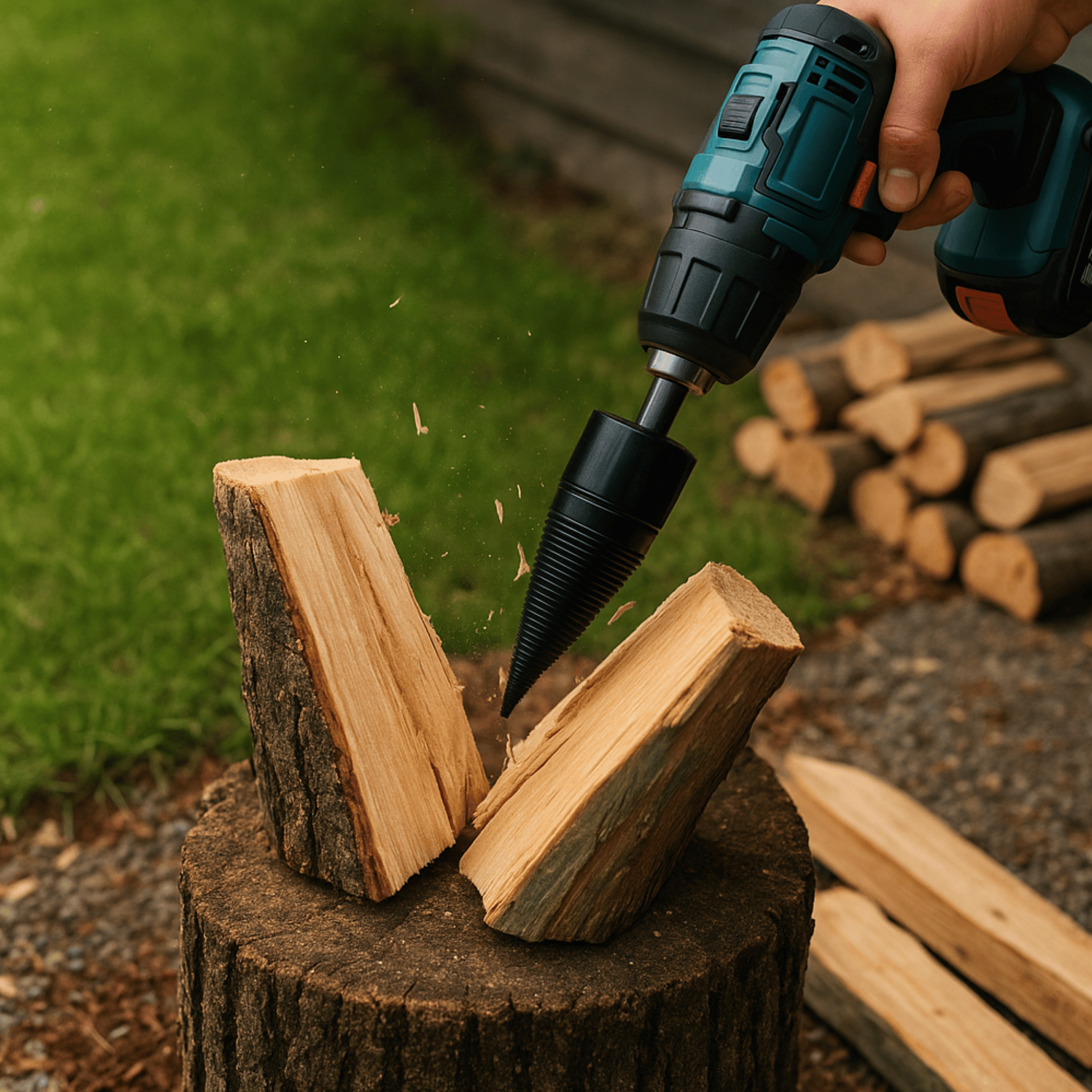 Simply clamp the EasyWoodSplit into your drill. Attach it, start it, split the wood – done.