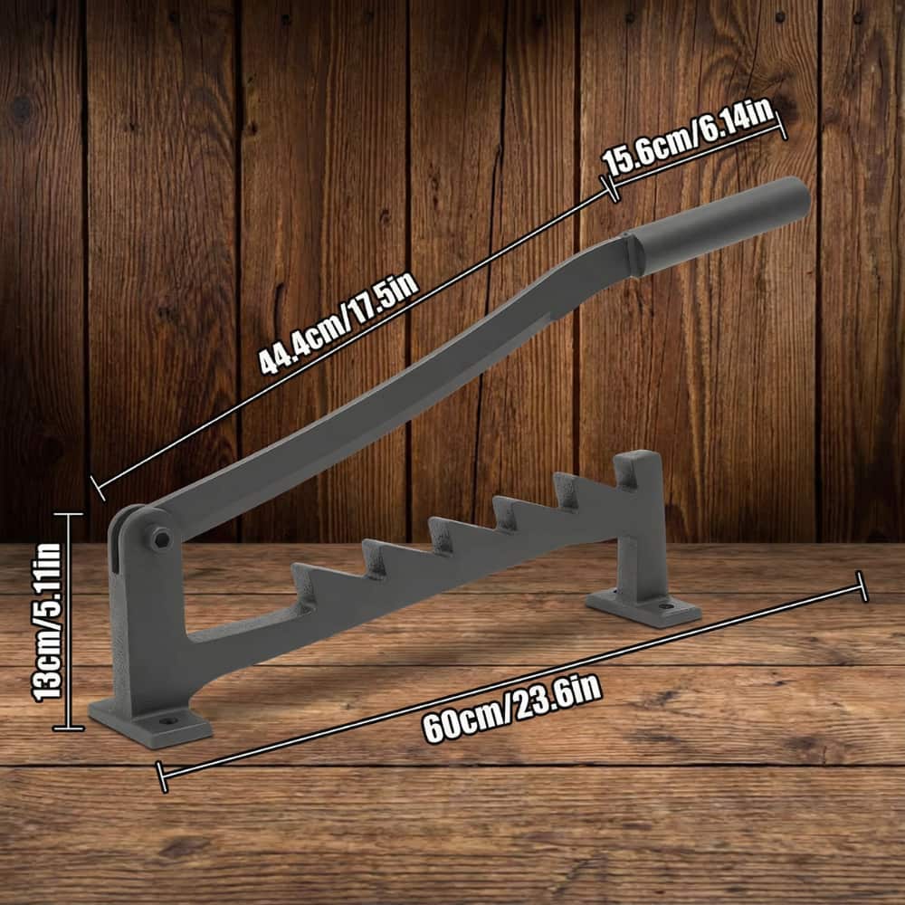 The splitter operates manually using a lever system and a gravity-assisted blade.