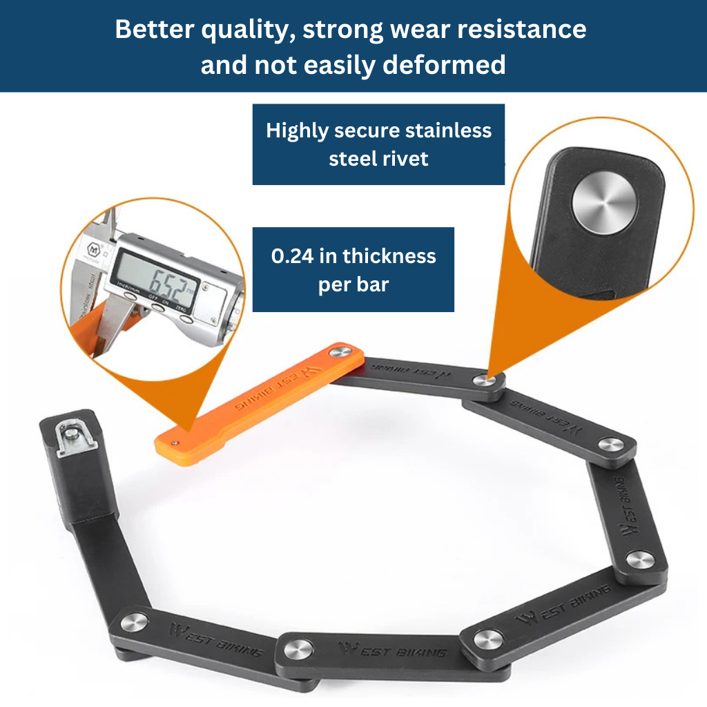 The Foldie Bike Lock utilizes an advanced connection method that makes the connection point particularly tight and strong. Made from hardened steel alloy, it is highly robust and resistant to tampering attempts.