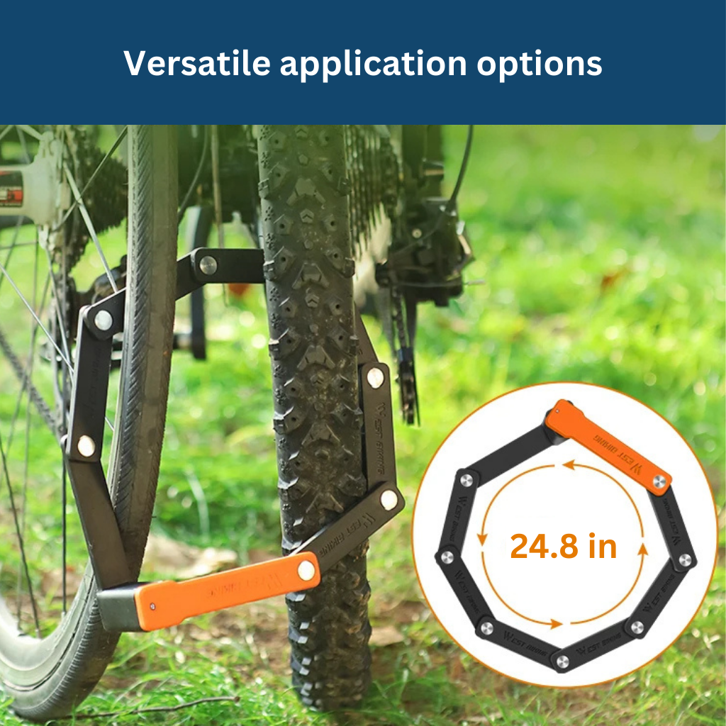 The Foldie Lock is versatile and perfect for various bike types like e-bikes, mountain bikes, road bikes, and scooters. With a chain thickness of 0.24 inches (6mm) and a length of 24.8 inches (630mm), it provides ample space to securely lock your bike and reliably protects against theft.