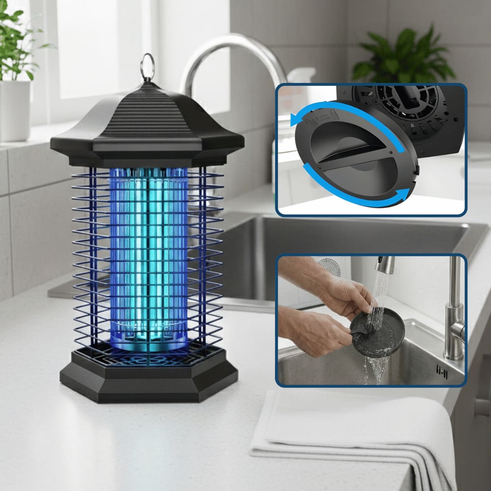Dead insects fall into the integrated collection tray, which can be easily emptied and cleaned using the included brush. The bulb is replaceable, ensuring long-lasting effectiveness.