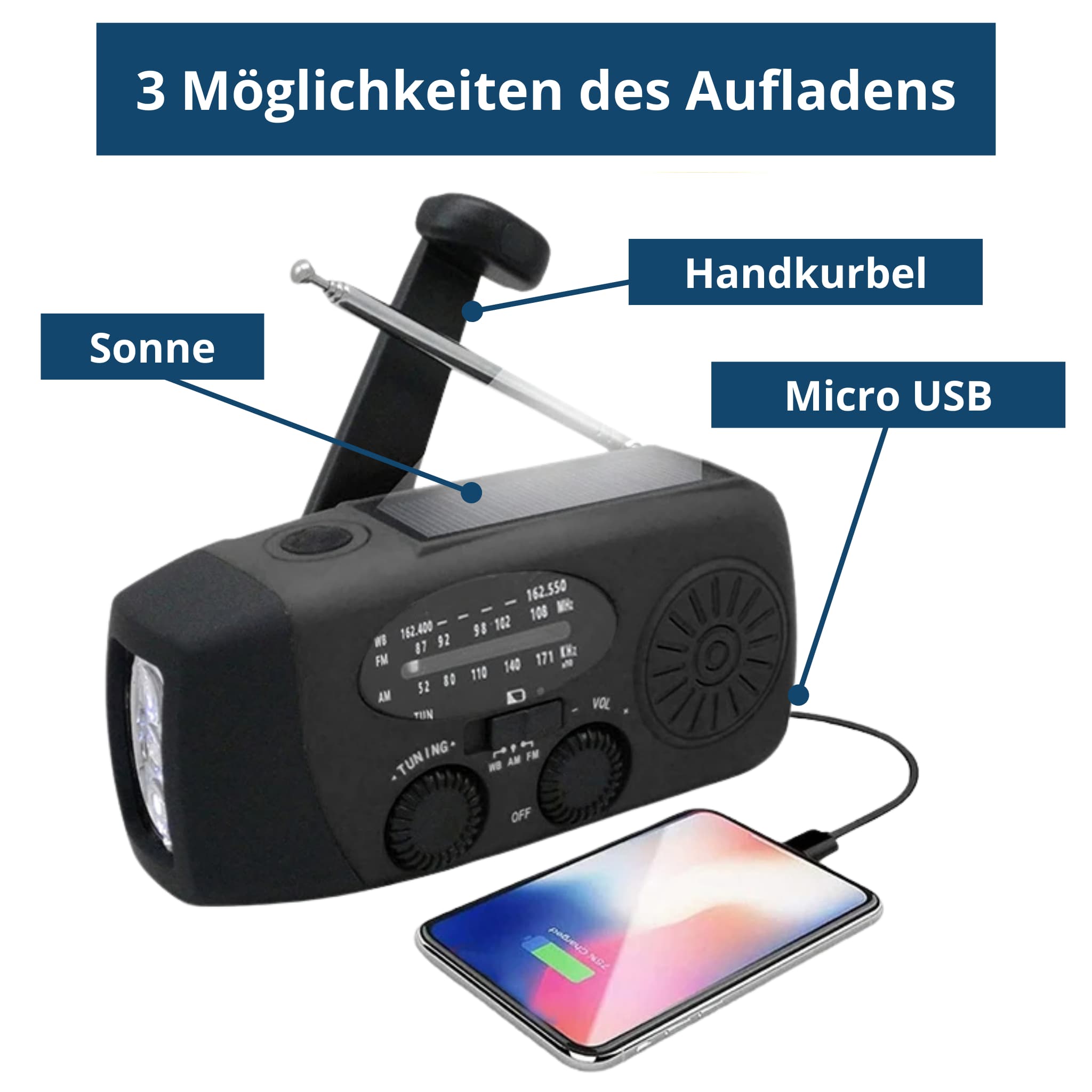 Handkurbel – erzeugt Strom jederzeit, sogar nachts oder bei schlechtem Wetter.