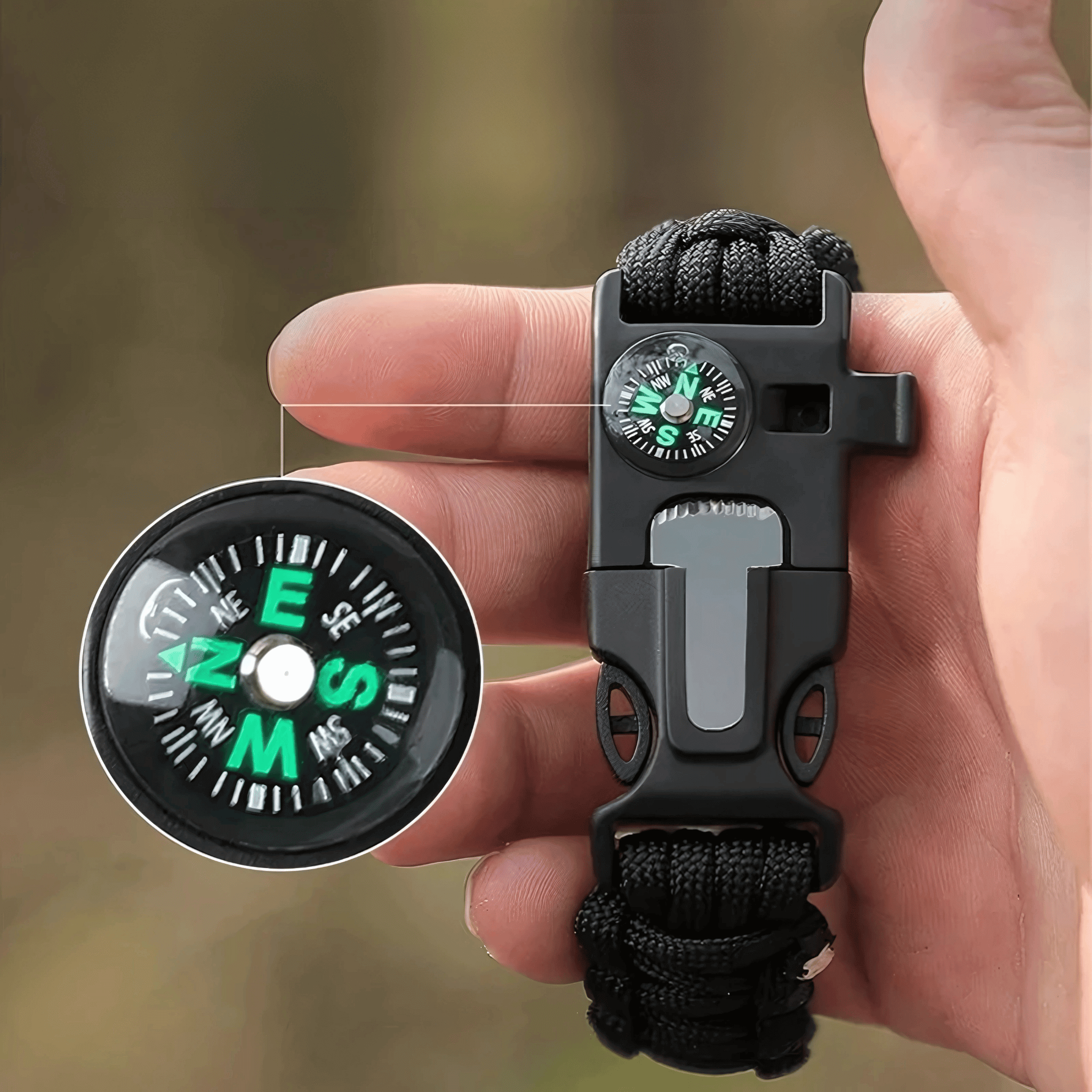 The bracelet combines five practical tools: a rescue cord, compass, fire starter, emergency knife, and signal whistle. This ensures you are prepared for many emergency situations.