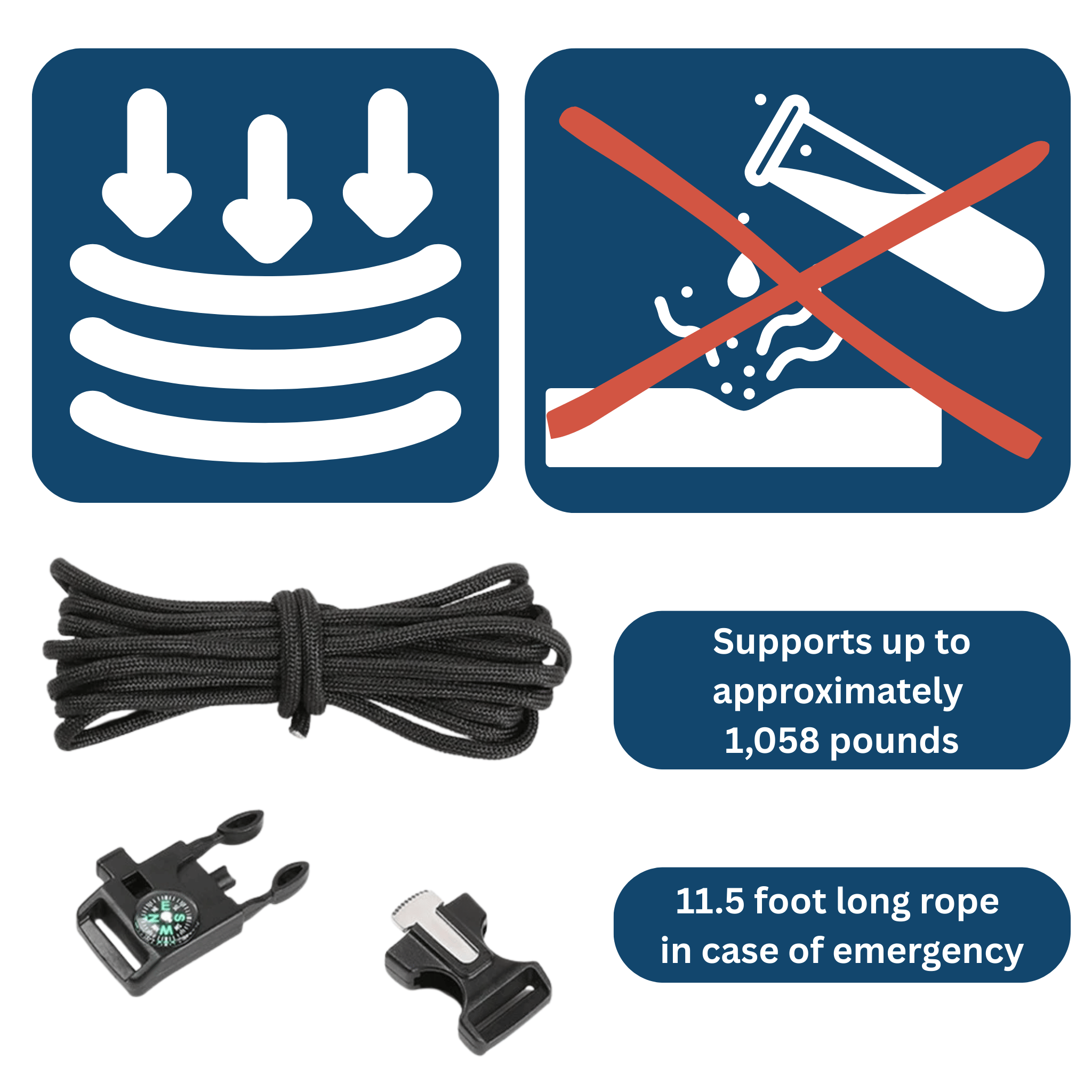 Made from high-quality 0.157 inch parachute cord, it can withstand a tensile force of about 1,058 pounds. The cord can be extended to about 11.5 feet in emergencies and is abrasion- and corrosion-resistant.