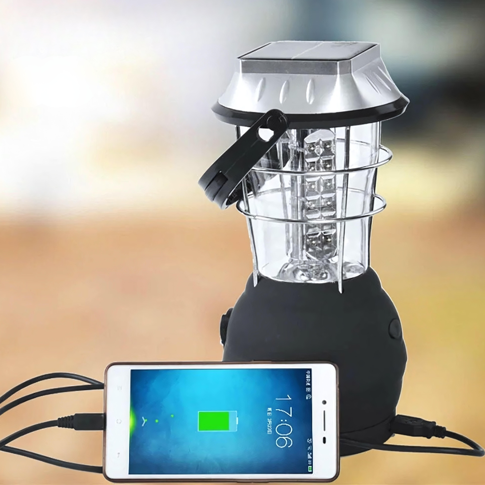 You can charge the lantern using solar energy, generate reliable emergency power with the hand crank, or connect it via USB to a power bank or wall outlet.