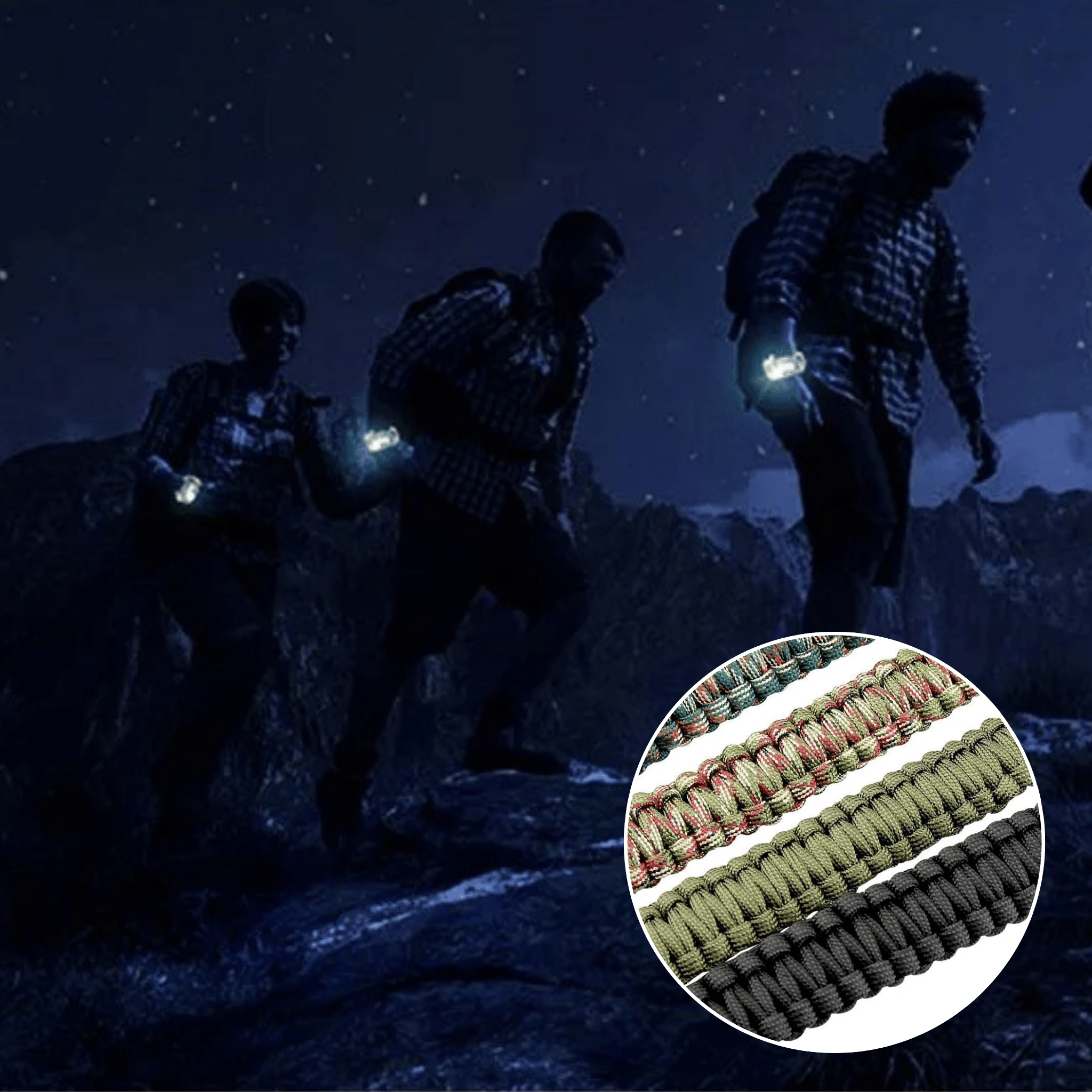 The multifunctional paracord survival bracelet combines a compass, firestarter, LED light, whistle, and rope into a single wearable.